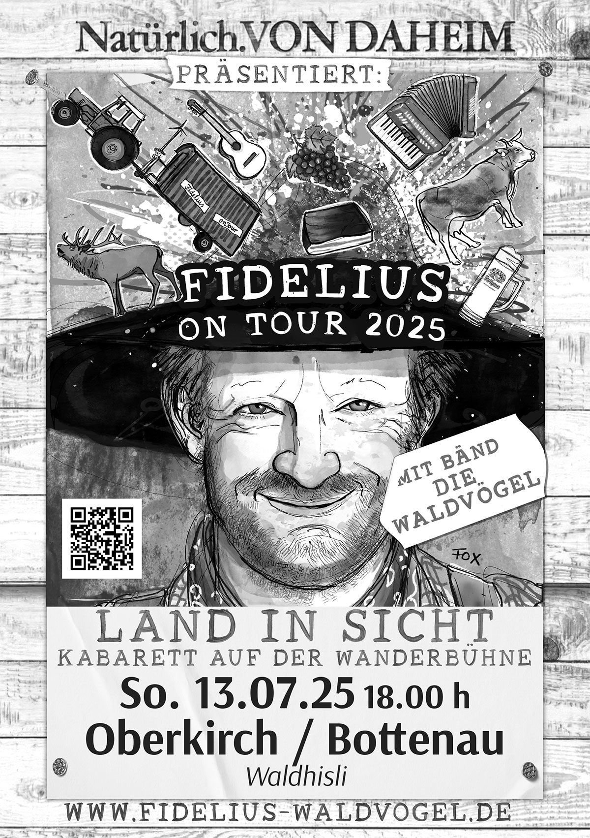 Erstmals mit an Bord: seine Band Die Waldvögel – ein Trio, das mit Bass, Schlagzeug und Humor für musikalische Heimatgefühle sorgt. Im neuen Programm „Land in Sicht“ trifft ländliche Lebensart auf kluge Gesellschaftskritik: Zwischen Hafermilch und GPS-gesteuertem Bulldog wirbelt Fidelius Fragen auf – und schenkt dem Publikum zugleich Leichtigkeit, Lachen und einen liebevollen Blick aufs Ländle.